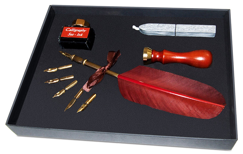 Box size 24.5×193 cm. Contains: 1 natural wax stick, 1 seal, a feather with 5 nibs and ink.