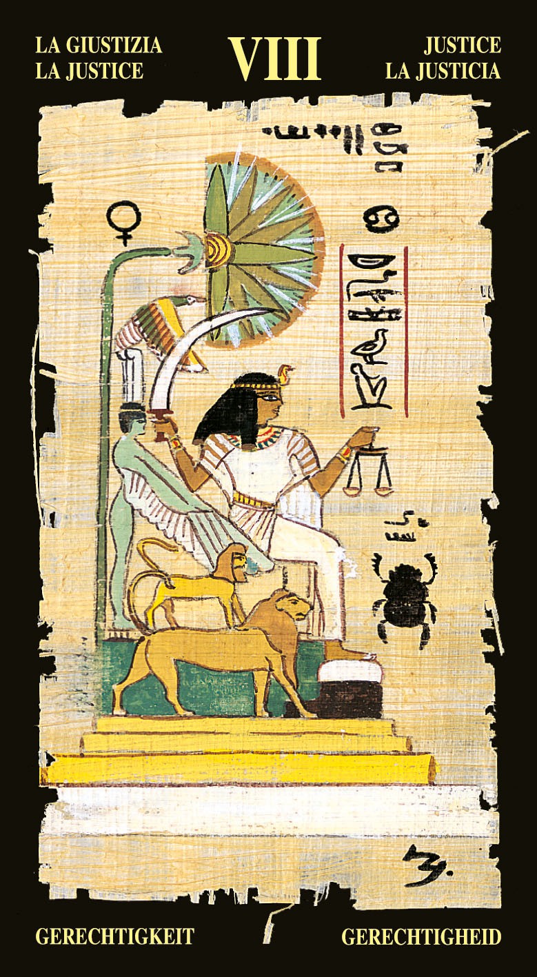 Made in tempera on papyrus, these cards are partly inspired by the Tarot designed by the famous occultist Jean-Baptiste Pitois in 1870. According to Pitois, the Tarot descended from the legendary Book of Thoth, a sapiential work that would have kept all the mysteries of Egyptian magic.