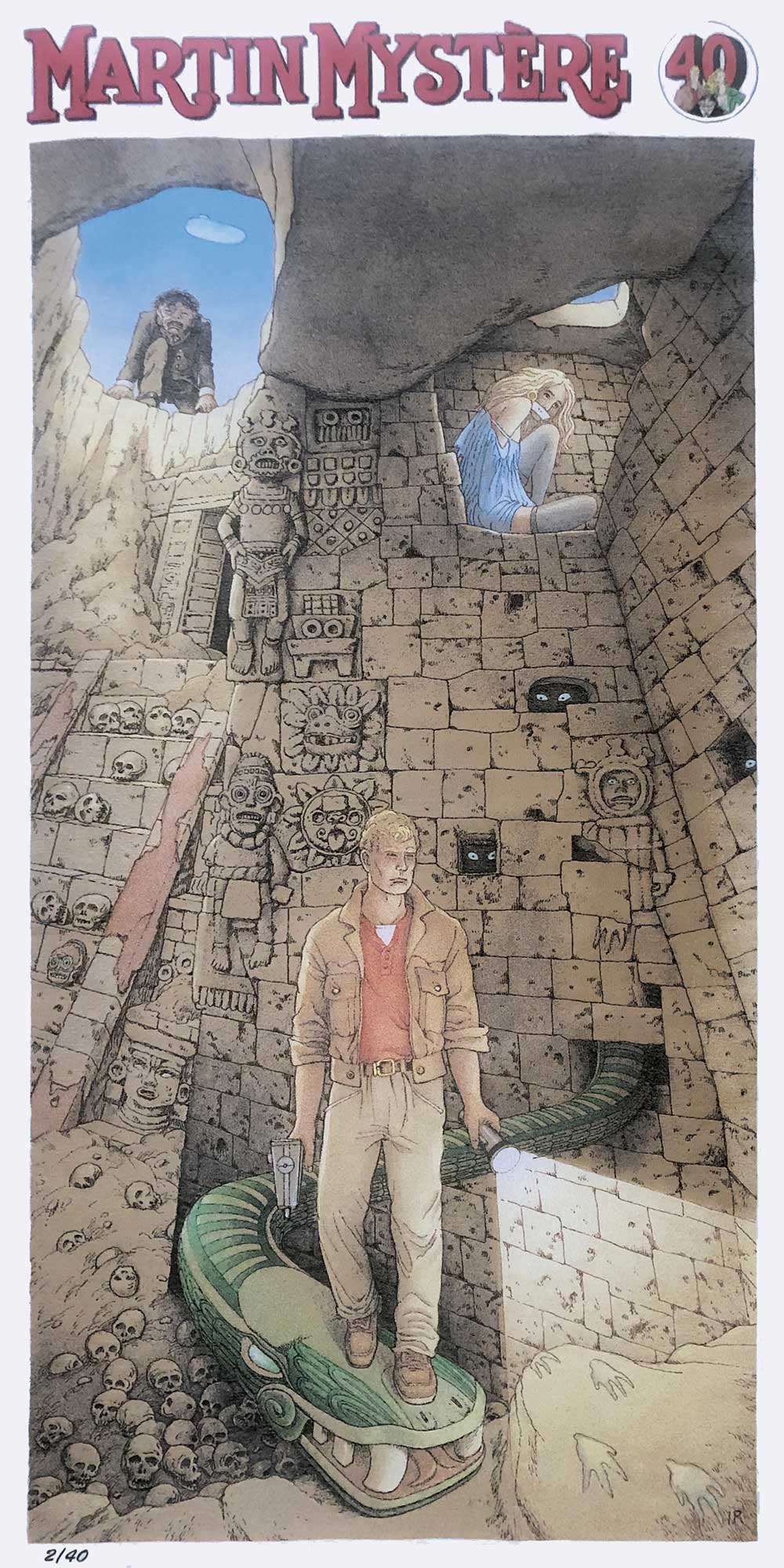 Lo Scarabeo in collaboration with Sergio Bonelli Editore present this work, specially made in watercolour by the artist Roberto Innocenti on the occasion of the 40th anniversary of Martin Mystère.In this image, the reproduction of the tapestry obtained by weaving on a loom the work specially created in watercolor by the artist Roberto Innocenti. Woven in Italy, in a precious edition of 17,360 threads, in 40 examples numbered in Arabic numerals plus 4 out of print; size 100×50 cm; packaging: plexiglass tube and cap with oring.