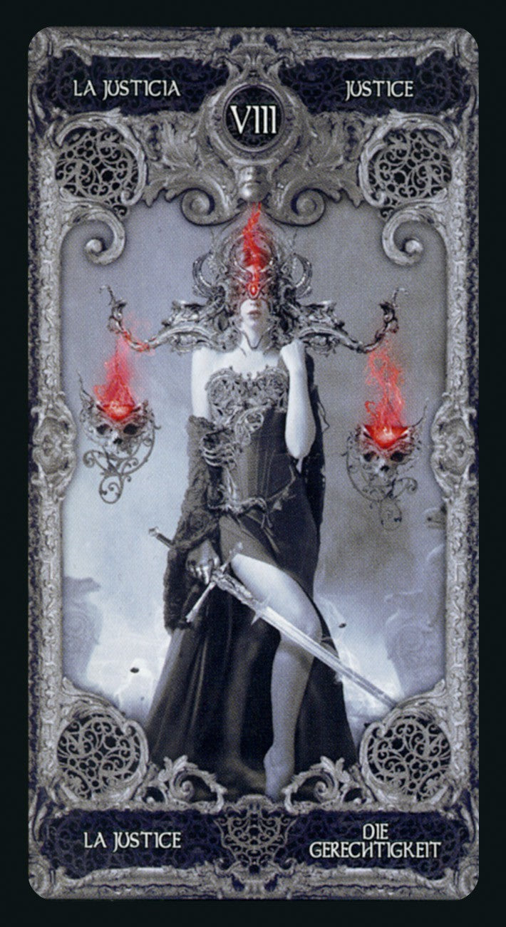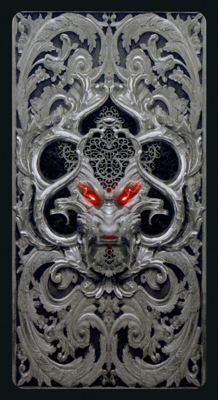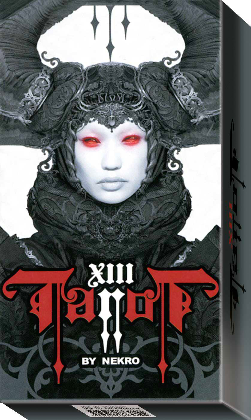 A deck of Tarot cards with a fine and elaborate design and unsettling elegance, with bright red elements on shades of gray and black.Art by Nekro, 78 cards, 66×120 mm; Instructions. Multilingual edition by Fournier publishing house.